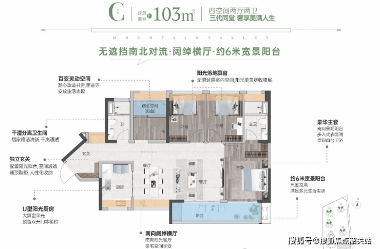 103㎡ 四房两厅两卫: 南北通透设计,配备超6米宽MAX宽景阳台,独立入户玄关,保证私密性,气派U型厨房。