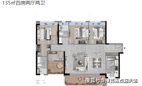 135-143㎡四房两厅两卫:兼顾多孩家庭或三代同堂需求,公共区域开阔;