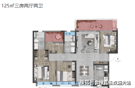 120-125㎡三房:空间更为舒展,主卧套房设计提升私密性;