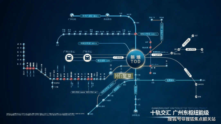 新塘TOD(Transit-Oriented Development),即以公共交通为导向的开发模式,是当今世界城市规划中最前沿的理念之一。路劲·星棠所在的区域,正是国内首个集高铁、城轨、地铁、城市公共交通、商业、市民广场等多种空间场景于一体的枢纽型城市综合体。总建面达35万㎡,相当于广州东站7倍的规模,未来九轨在此交汇,建成后能实现湾区1小时生活圈,名副其实的“湾区中央车站”。