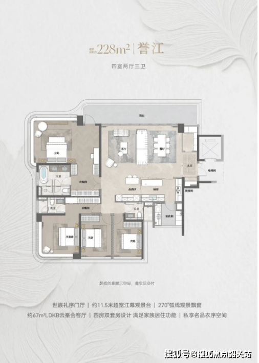 205㎡/228㎡奢阔四房:270°环幕全景舱视野,L型阳台长达16米,主卧开间达6.8米,配备超28㎡超级主套;