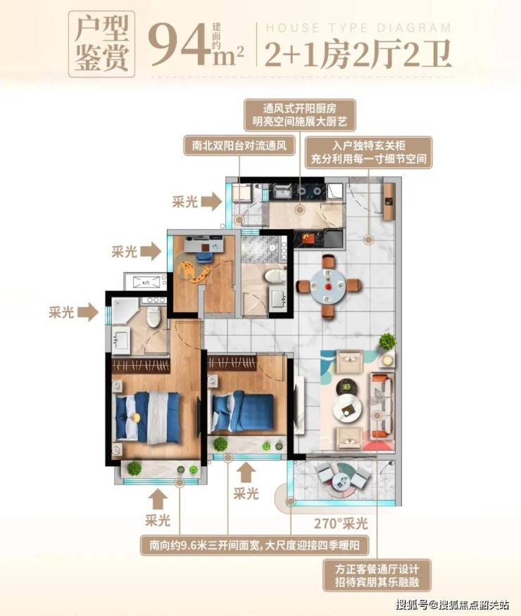 春风名苑的户型设计非常人性化,提供多种尺寸的三房和四房选择,适合不同家庭的需求。项目现推出的主力户型包括94㎡三房和119㎡四房两种,均为南北通透设计,保证室内光线充足,空气流通。以下是户型亮点: