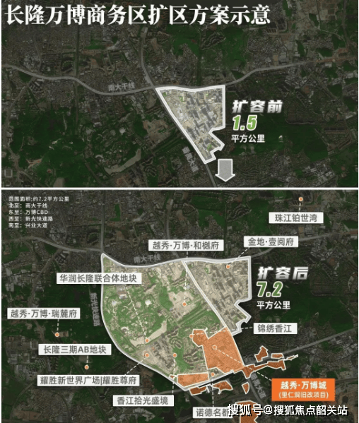2024 年 4 月,万博官宣扩容,占地面积由 1.5 平方公里延展至 7.2 平方公里,覆盖长隆、里仁洞片区,规模超越珠江新城,剑指世界级地标商圈。此次扩容实现了长隆与万博的深度绑定,板块整体价值大幅提升。