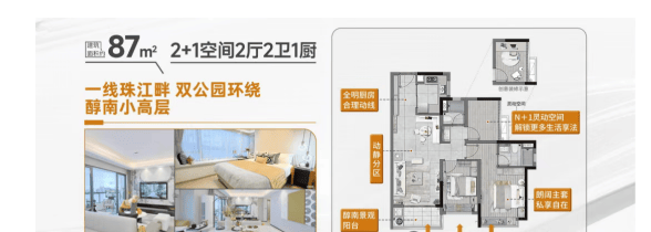 越秀·天瀛位于荔湾区海龙科创区核心地带,是2021年广州首批集中供地中由越秀地产以26641元/㎡楼面价竞得的兴达地块。项目占地面积约4.8万平方米,总建筑面积约16.8万平方米,规划7栋15–26层小高层住宅(含1栋人才安置房),总户数876户,容积率仅3.5,绿化率达40%,在荔湾新盘中属罕见低密社区。主力在售户型为建面约87㎡、104㎡、125㎡三款“N+1”创意空间产品,使用率超90%,80%以上单位可南向望珠江,部分楼栋距江岸仅约50米。项目已进入准现楼阶段,首批楼栋于2024年12月交付,是当前荔湾区单价最低的新房之一,主打“主城江景+低密宜居+高性价比”组合。