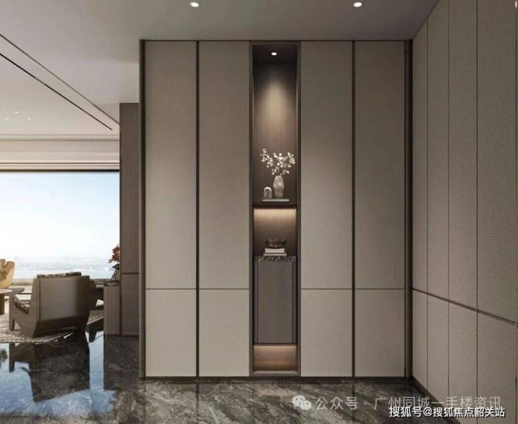 再比如,入户空间非常宽敞,足以打造一整面收纳柜、艺术柜。