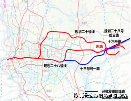 五条地铁:地铁13号线(已开通,鱼珠-官湖-新沙,贯穿广州第二CBD和新塘商圈)、地铁23号线(规划已落实,赤沙滘-新塘客运站-坭紫,联通东部交通,预计2022年动工,2026年完工)、地铁16号线(规划已落实,新塘-新塘客运站-富鹏路站,联通新塘仙村石滩和荔城)、地铁20号线(规划中,中心城区-新塘站-江南,串联天河、黄埔组团与新塘站的联系)、地铁28号线(规划中已发招标,佛山-新塘站-东莞,串联佛山、城区、增城和东莞的联系)。