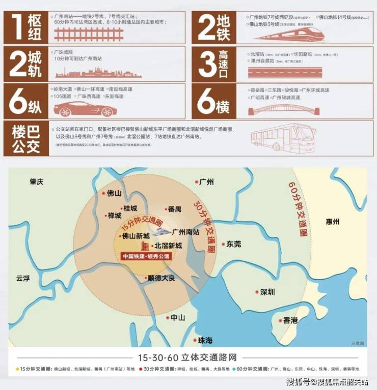 中国铁建·领秀公馆交通便捷,拥有1枢纽+3地铁+2城轨+3高速口+多公交+6纵6横的立体交通网络。楼巴接驳佛山地铁3号线及广州地铁7号线北滘公园站,未来还将规划地铁14号线骏悦路站,公交站就在家门口,无论是前往广州南站还是广佛核心区域,都能实现快速通达。