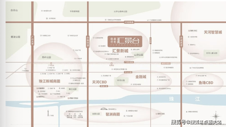 项目位于广州市天河区的汇景新城社区东北部,龙熹山北侧。行政区划属于天河区,是广州中心城区不可多得的低密度豪宅板块,距离珠江新城直线距离约8公里,属于“出则繁华,入则宁静”的城央秘境。