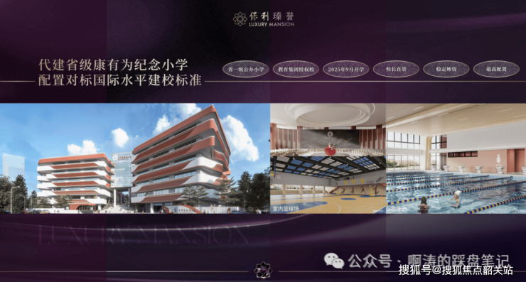 保利斥资约2亿全资代建省一级康有为纪念小学(36班公办学校,2025年9月开学),步行可达。教学配置高,对标国际水平的建校标准,室内配备游泳馆、报告厅、图书馆、篮球馆等,室外坐拥400米标准环形跑道,足球场等设施;