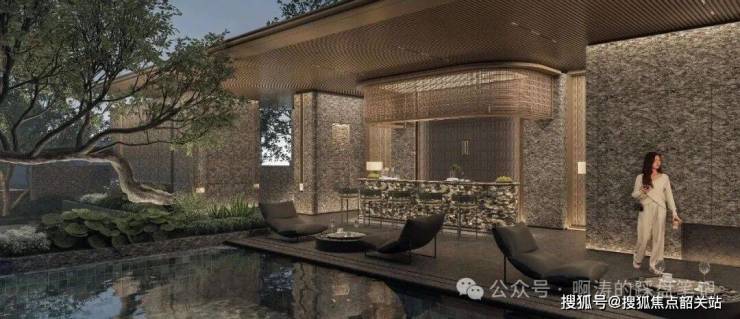 规划约550 ㎡成人泳池、约 40 ㎡的儿童池及按摩池,并打造星级酒店会所吧台。对标顶级安缦酒店风格,选用被誉为“奢华酒店的鼻祖”的华尔道夫酒店同款南亚宇宙黑奢石,打造高约 5.5米的仿生自然生态流水瀑布,搭配奢石中的“爱马仕”——铂金钻 吧台,尽显奢华;