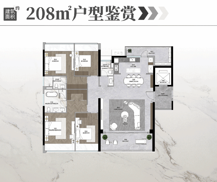 208㎡ 4房2厅3卫:约6.8m宽LDKB大方厅,南北双阳台,双主套行政级配置。