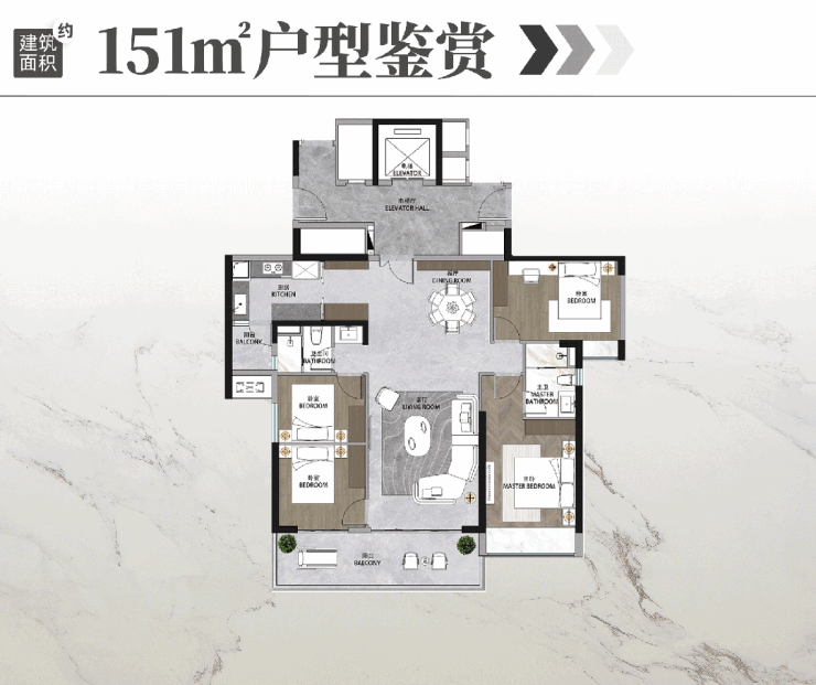 151㎡ 4房2厅2卫:板式独梯独户,央景花园大宅,十字动线高使用率。