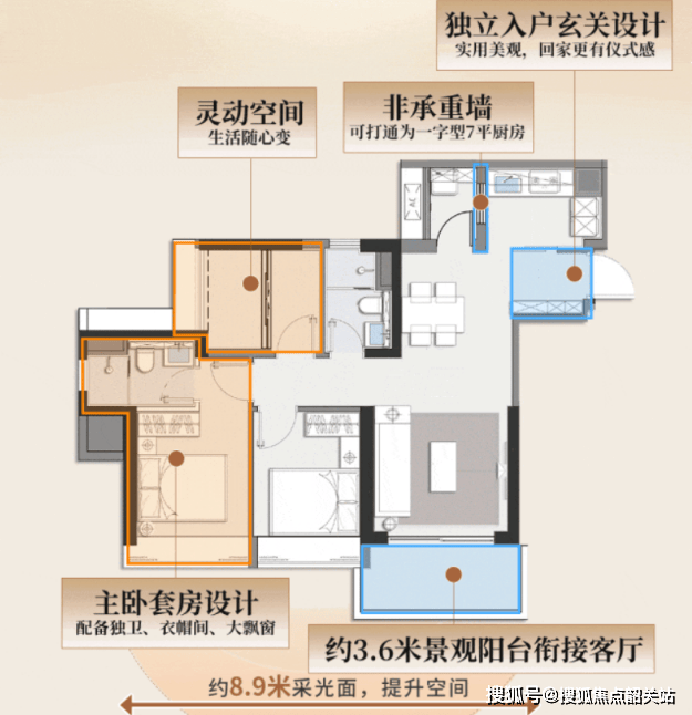 客厅与阳台相连,采光通风表现不错,总价360万起,适合预算有限的刚需家庭。