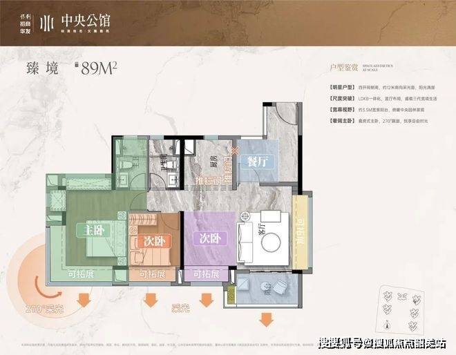 得房率85%:通过飘窗、阳台半赠送设计,实际使用面积达89㎡;