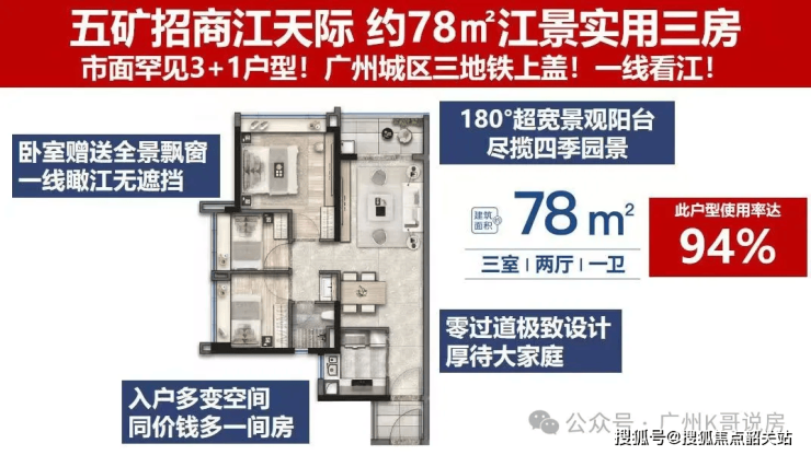 建面约88㎡三室两厅两卫:户型赠送独立入户花园,实用率超92%,宽尺主套设计,预留衣帽间空间,充分保障主人私密性与舒适度。卧室全明飘窗,主卫干湿分离,居住体验极佳。南向望江布局,最高可实现270°瞰江视野,将珠江美景尽收眼底,既适合改善型家庭居住,也能满足追求江景体验的刚需群体。