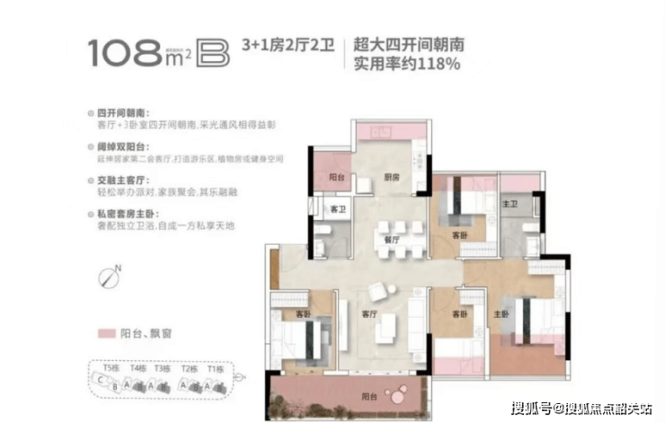 项目主力在售建面约 98㎡3+1 房、108㎡四房、156㎡4+1 房三大户型,全系四房起步,纯南向板式设计,使用率均超 110%,最高达 118%,空间实用性、舒适度双优。