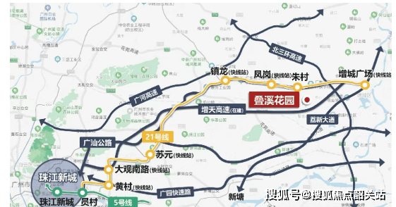 叠溪花园地处广州东部增长极的核心地带,北接广汕公路直达天河中心,南通荔新大道、广园快速路和济广高速,并且临近正在建设中的增天高速。通过这些交通动脉,居民能够迅速抵达广州市区及其他重要区域,极大地提升了出行便利性。此外,项目距离地铁21号线朱村站仅一步之遥,4站快线即可到达天河,为上班族提供了极大的便利。