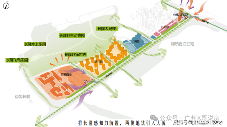 主要原因在于,长达近2公里的超级地块,把分隔的长隆旅游大IP+万博商务区两大板块缝合起来。