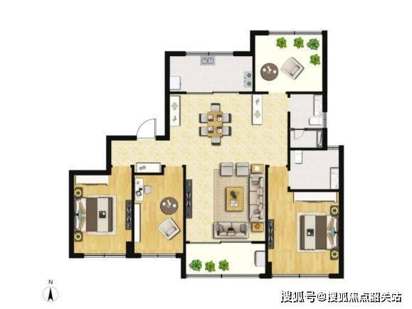 这款户型堪称经典,虽面积不大,但功能齐全,十分适合刚需购房者。传统布局让空间利用更加合理,动静分区明确,保障了居住的舒适性与私密性。2 + 1 房的设计灵活性高,多出的一房可根据家庭需求改造成书房、儿童房或衣帽间等,满足不同生活场景。两卫配置方便家庭成员使用,避免早晚高峰的拥挤。客厅与餐厅相连,空间开阔,连接阳台,采光通风俱佳,为家庭活动提供充足空间。整体而言,该户型以其高性价比和实用性,为年轻家庭或单身人士提供了温馨舒适的居住空间。