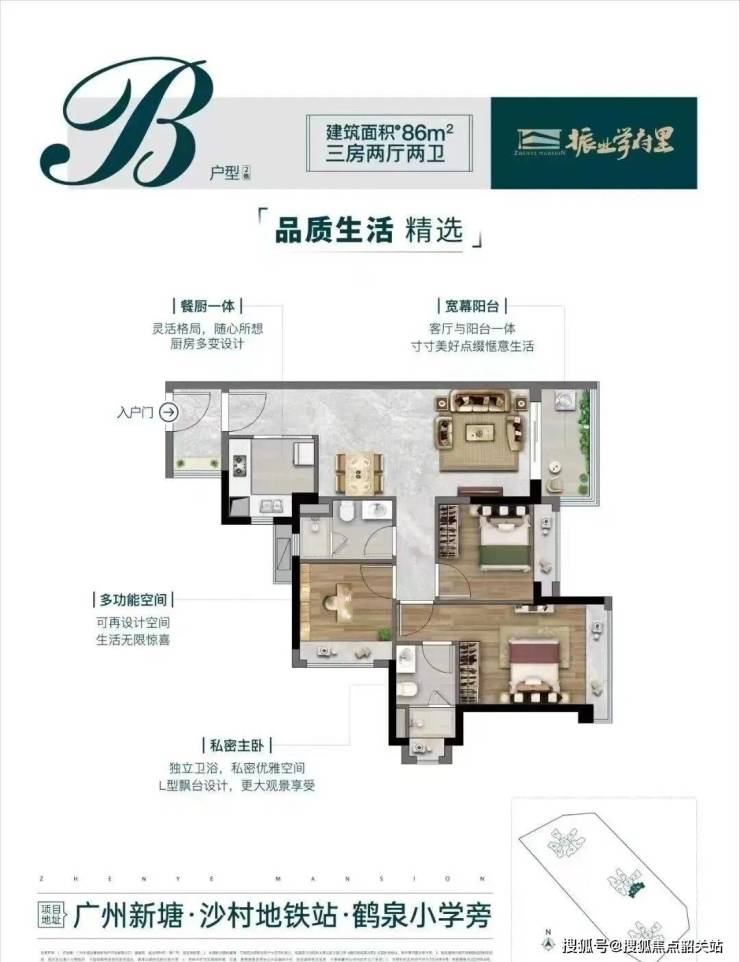 75㎡三房,项目做出了新塘唯一的单边位设计,保证了南北对流和360°景观视野。