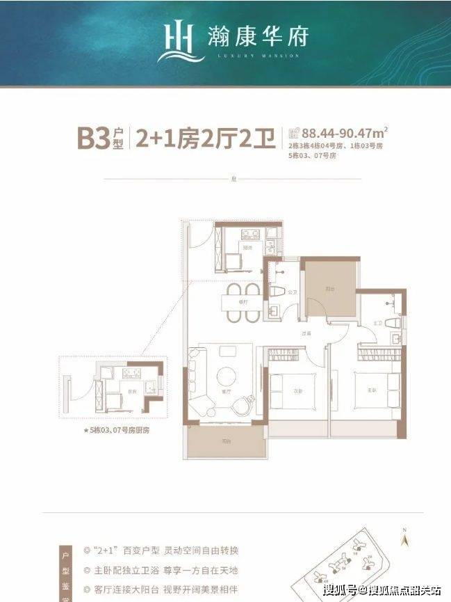 1 栋 03 号房(90㎡,2 + 1 房 2 厅 2 卫)