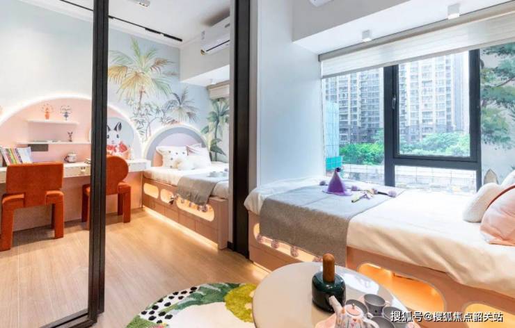 最后看看,建面约98㎡的4房2卫,简直秒杀市场上同面积户型,使用率达到96%。它不仅设计出罕见的五开间朝南,餐客厅还实现了南北对流,最妙的是,厨房尺度堪比建面120㎡的房子。来看一张实景图,我就问你大不大?| 98㎡厨房样板房实景图你可以参考样板房,做一个全景可开合式厨房,搭配岛台,让下厨成为一家人感情交流的绝佳场所;也可以拿掉岛台,装一扇折叠推拉门,做饭的同时,也能盯着玩耍的孩子。| 98㎡餐客厅与厨房实景图至于卧室,更是延续89㎡的优点,南向双孩房可拉通可间隔,主卧仍是三面采光,利用北向飘台做衣帽间或梳妆台再适合不过。主卫也用尽飘窗,尺度与客卫几乎等比例。| 98㎡主卧板房实景图项目带装修交付,玄关柜、厨房三件套以及卫浴三件套都会赠送。4 房 2 厅 3卫丨 建筑面积约 108㎡稀贵双套房 阔绰奢享家
