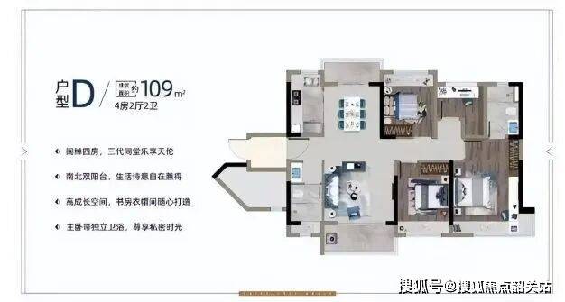 109㎡四房两卫:南北通透,主卧套房化,次卧与儿童房分区明确,适合二胎或三代同住家庭。