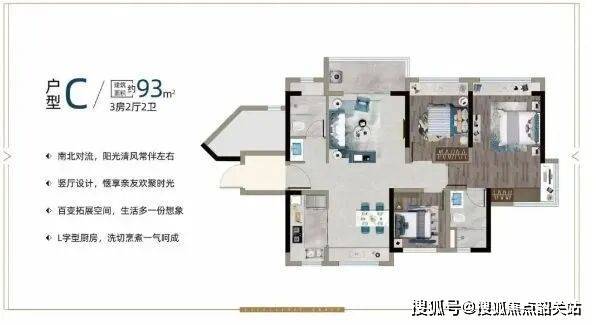 93㎡三房两卫:双阳台配置,公区尺度更宽裕,兼顾采光与收纳;