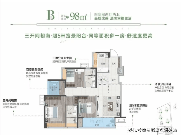 伴山溪谷在售户型包括约85㎡三房两厅两卫、98㎡四房两厅两卫以及103㎡四房两厅两卫(横厅设计)。这些户型的设计充分考虑了空间利用效率,例如85㎡户型实现了南向三房带主套设计,生活更加随心所欲;98㎡户型则拥有超5米宽阳台,通风采光更佳;103㎡户型更是南北通透,配备了超过6米宽的MAX宽景阳台,视野开阔。所有户型均采用U型大厨房设计,确保洗切煮炒一气呵成。