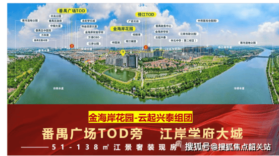 番禺广场TOD 江岸学府大城——金海岸花园位于广州番禺亚运大道,处于市桥东区中心,紧邻清河大道和黄金水道市桥水道。作为湾区战略要地,金海岸花园不仅坐拥大湾区枢纽门户的优势,而且地处城市新轴心之上,是下一个珠江新城的价值中心。项目规模宏大,占地约66万平方米,绿化率达到了35%,为居民提供了一个舒适的生活环境。