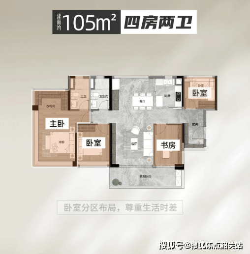 约105㎡四房:单边户设计,南北通透,三代同堂一步到位;