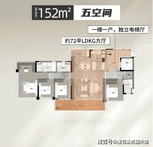 约142–152㎡改善大平层:14层板楼小高层,一梯一户,独立阳光电梯厅(约11㎡),双南向套房+三卫,主卧带浴缸,对标200㎡豪宅体验。