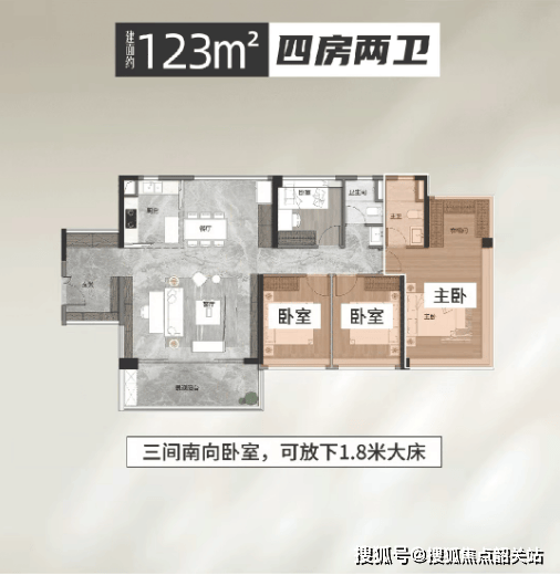 约123㎡四房:卧室均可放下1.8米大床,居住体验接近144㎡大宅;