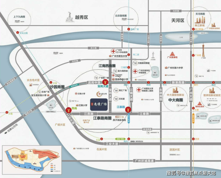 中冶·逸璟广场坐落于广州城市发展主轴——海珠核心板块,地理位置极具战略意义。项目位于宝岗大道与江燕路交汇处,紧邻江南西商圈,步行即可抵达地铁2号线江泰路站,同时临近8号线、广佛线及在建中的11号线,形成四轨环绕的立体交通网络,快速连接珠江新城、琶洲、金融城等多个核心区。周边配套成熟,涵盖教育、医疗、商业等多个维度,真正实现“出则繁华,入则宁静”的理想生活状态。综合来看,无论是当前的生活便利性,还是未来的升值潜力,这里都占据着不可替代的战略高地。