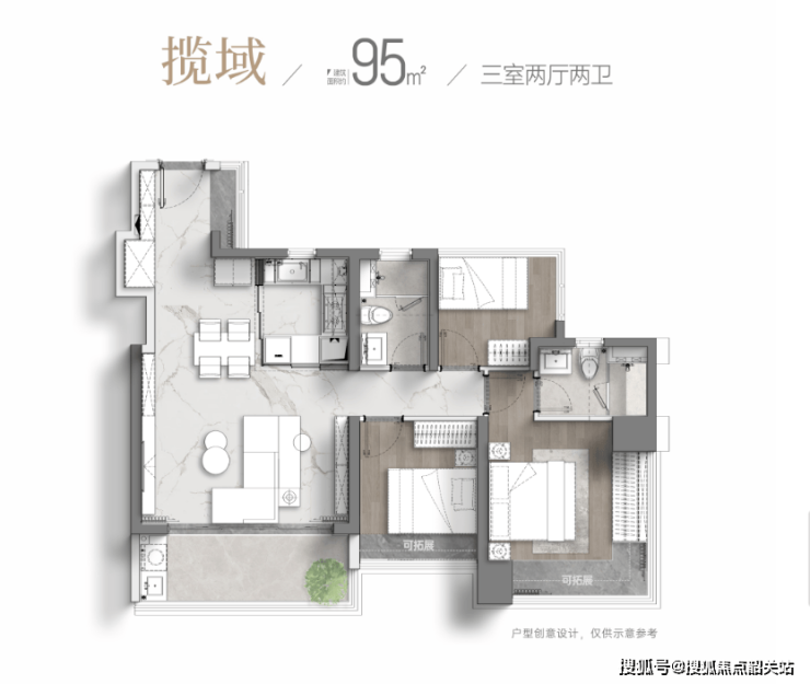 89㎡三房:竖厅设计,四开间朝南,主卧270°飘窗,得房率达98%(市测绘中心报告)