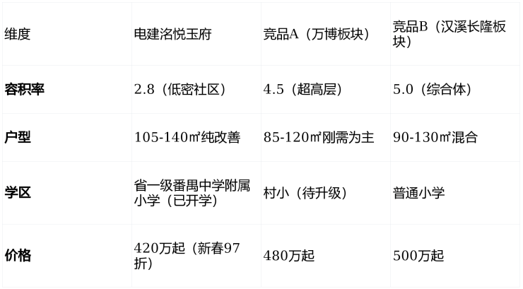 “万博、汉溪长隆适合‘投资+出租’逻辑,但自住需忍受高密度和噪音;电建洺悦玉府是番禺改善客‘退一步海阔天空’的选择——用万博80%的价格,买120%的居住体验。”