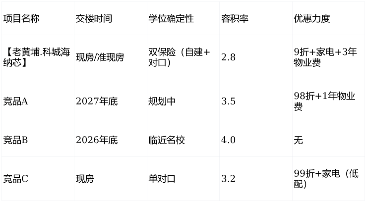 结论:【老黄埔.科城海纳芯】在时间确定性、教育确定性、居住品质和优惠力度上全面领先,是2026年入学家庭的最优解。