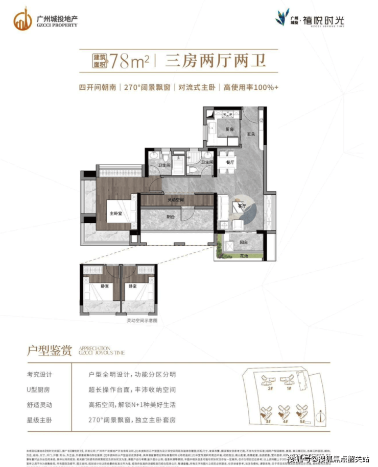 约 78㎡户型(三房两厅两卫):四开间朝南,带有 270° 阔景飘窗,主卧采用对流式设计,使用率超 100%。户型全明设计,功能分区明确,U 型厨房操作台面长,收纳空间丰富。