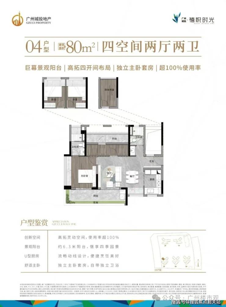 新加推80㎡户型(四房两厅两卫):6.3米宽阳台,使用率超100%!整个花都首个80方能做4房户型!