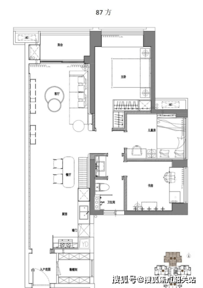 87平方米户型:该户型设计紧凑,北向布局,开间3.4米,配备一个卫生间,实际使用面积较小,适合预算有限的家庭。