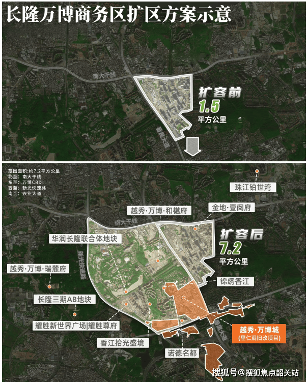但是,变局已至。2023年4月,官方正式官宣万博扩容,版图从1.5平方公里瞬间扩张至7.2平方公里!这一举措,不仅将长隆片区、里仁洞片区全盘纳入,其规模更是超越了6平方公里的珠江新城。这意味着什么?意味着万博、长隆、里仁洞终于完成了深度绑定,形成了一个真正的“超级三角”。