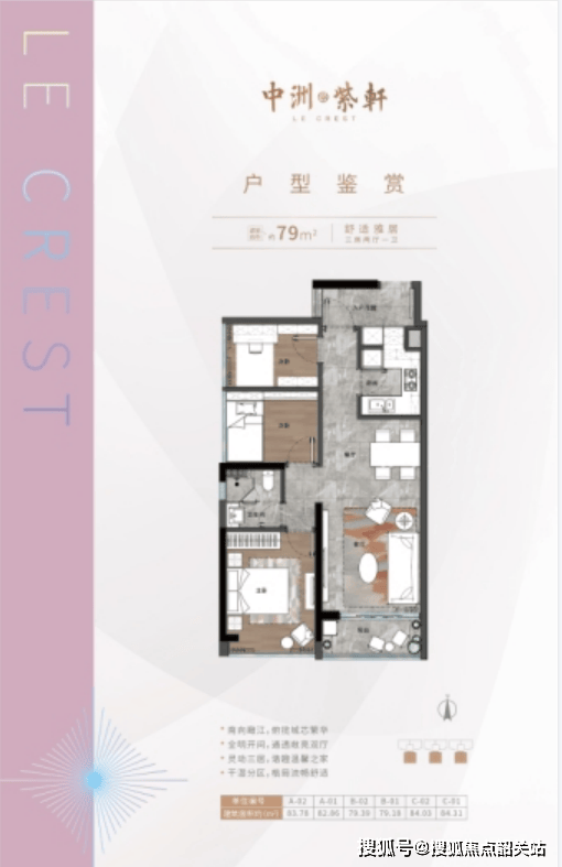 79-84㎡精致三房:专为年轻夫妻或首置家庭设计。户型方正实用,三房两厅一卫布局紧凑高效;卧室均带飘窗,提升采光与空间感;虽客厅尺度适中,但足以满足日常起居与社交需求,是高性价比的入门之选。