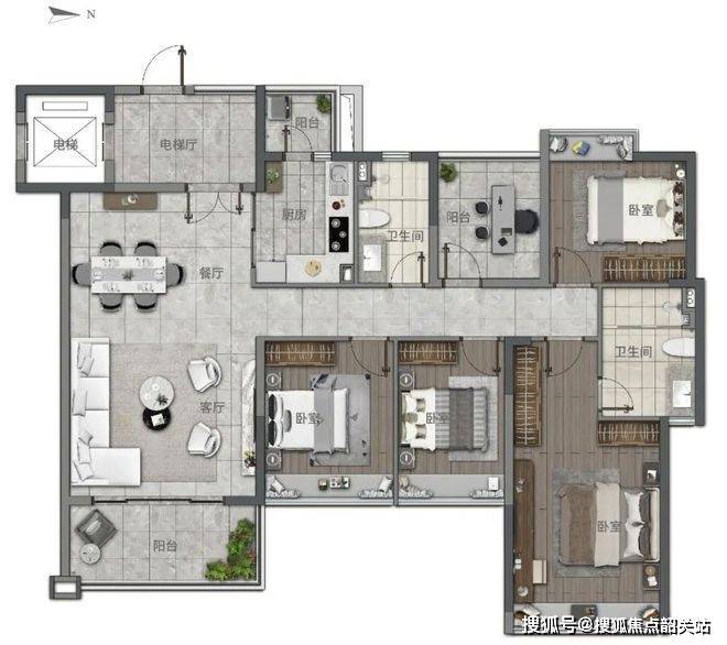 以建面约143㎡ 4+1房户型为例,带私家电梯厅,客饭厅直厅布局,厅出阳台。