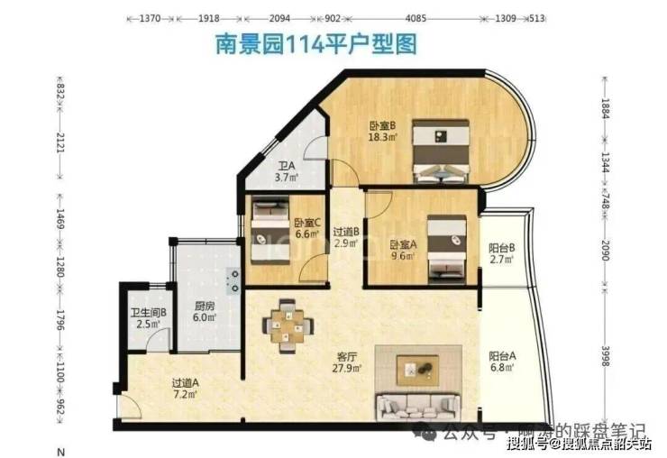 南景园:建成2000-2005年,65平两房至137平四房,贝壳近期成交价3万/平,中间面积114平户型为三房两卫。