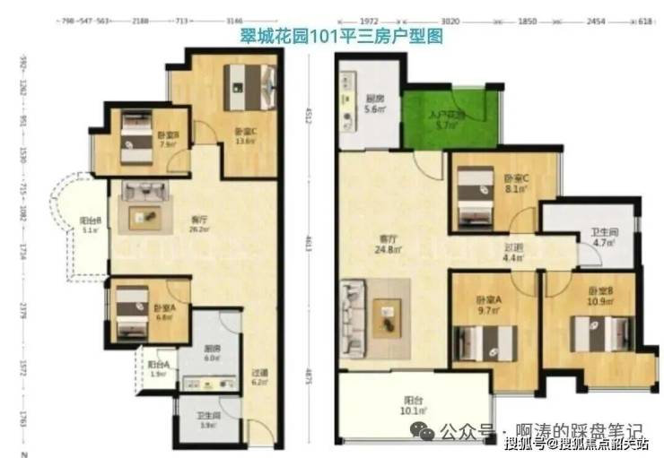 翠城花园:大型小区,2001-2012年建成,共分为6期(忽略翡翠轩),50平一房至150平四房,贝壳展示成交均价3.74万/平,中间面积101平户型为三房一卫。