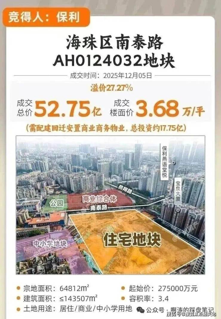 海珠西南泰路地块(即翠城花园东地块),经过76轮激烈竞价,被保利以350000万元总价拿下!