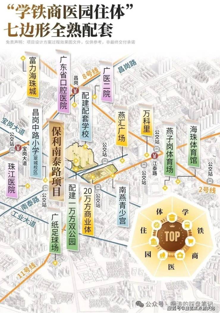 这里反手就是一个38万平综合社区,从配套来看,保利南泰路项目所有牌面筹码都已经摊开——一个“学铁商医园体住”七边形全熟配套圈。