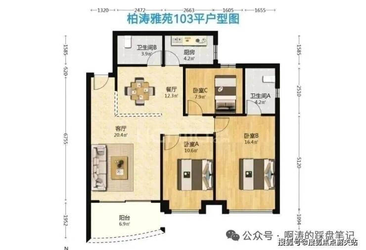柏涛雅苑:建成于2001-2008年,38平一房至130平四房,贝壳近期成交价3.16万/平,中间面积103平户型为三房两卫。