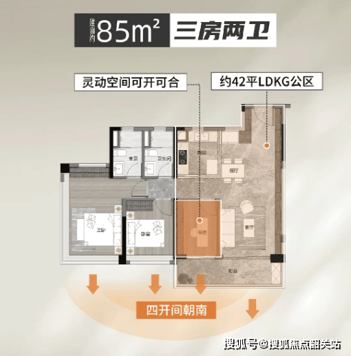 85㎡三房两卫:配备约6米大阳台,空间通透感强,实用性远超同面积段竞品;
