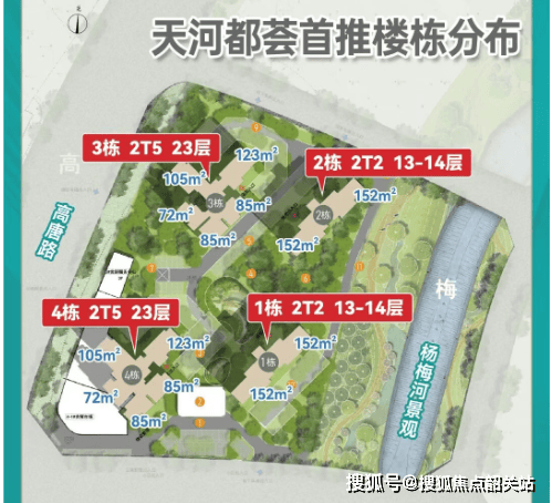 所有楼栋均为13–32层小高层或高层,其中北地块1、2栋为13–14层纯板式小高层,2梯2户,安静临河;南地块1–4栋为15层小高层,2梯3户;5–8栋为32层高层,延续爆款户型。